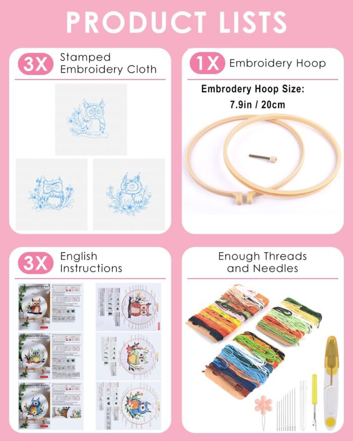 【What Will You Get】1* embroidery hoop, 3* embroidery fabric with pattern, enough color threads and embroidery needles, 3* instructions, 1* scissor, 1* needle threaders, 1* Seam ripper.