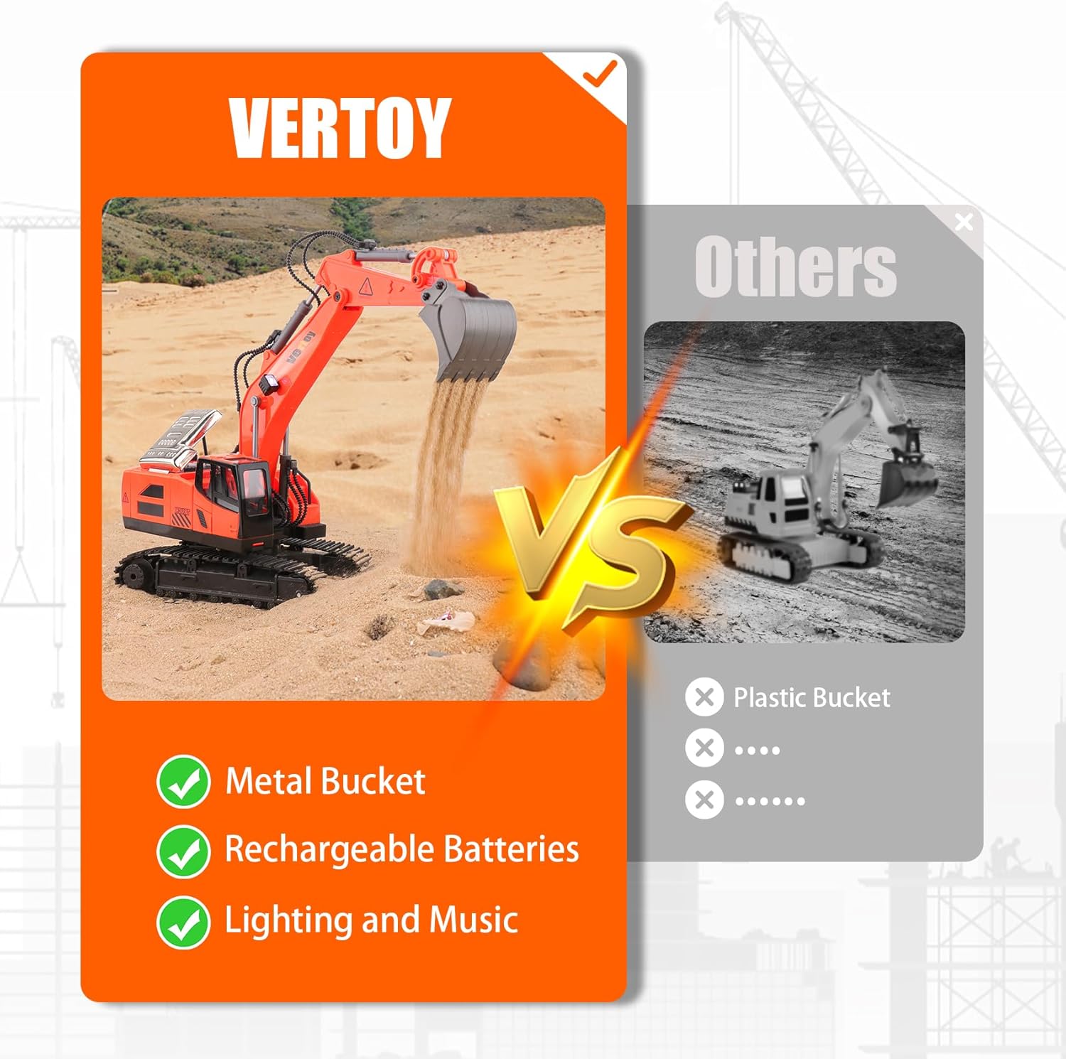 2 Batteries for Lasting Joy: 2 rechargeable batteries enable excavator-love kids to enjoy longer entertainment performance. The better quality, the longer pleasure.