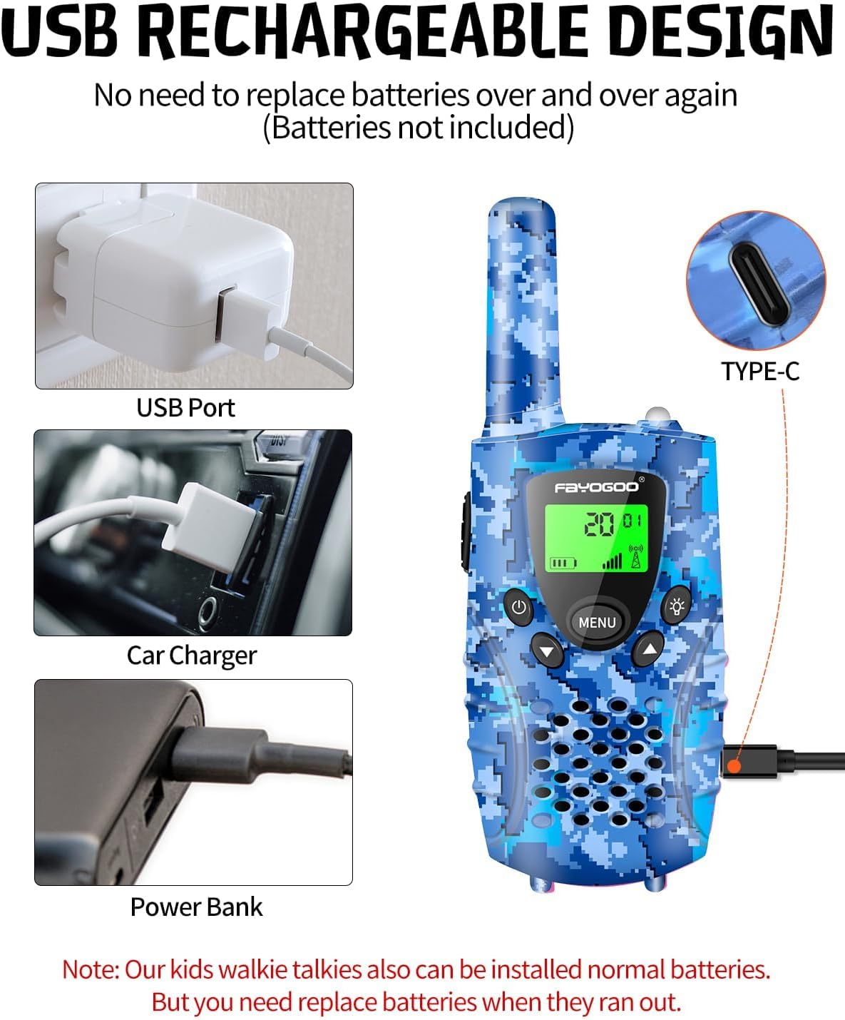 Convenient Rechargeable Design: Our walkie talkies for kids have a rechargeable function. You can charge them directly by Type-C port when you use the rechargeable batteries. You needn’t replace the batteries over and over again. (PS: These rechargeable walkie talkies will come with charging cables but not batteries