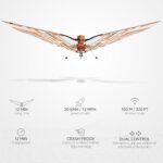 TECHNICAL SPECIFICATIONS – Ultra-light: 12.2 g/compact – 380mm wingspan – Robust body structure, elastic wings, tail, legs and head to protect against impact. – Specially developed reinforced bearing micromotor (1.6 Watt) – Patented, fully symmetrical flapping wing mechanism with integrated micro speed reducer. – Precise and immediate directional control by deforming the wings for aerial stunts. – Efficient glide thanks to its very low weight-to-wing-area ratio (3.7 g/d2). Controllable glide. – Takes off and lands on the ground thanks to its legs. – Flies both inside and outside.