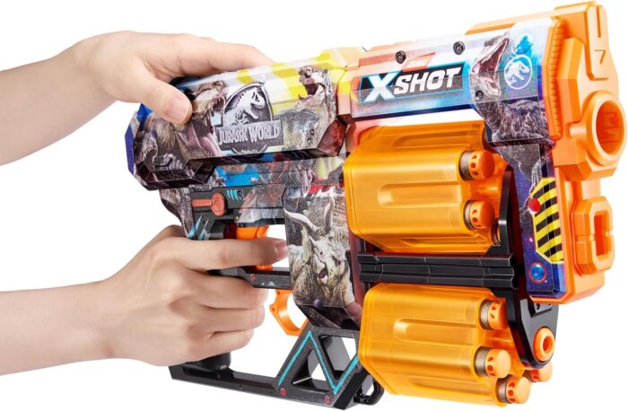 Skin your blaster with the Awesome power of the dinosaurs from Jurassic World! With a 12-dart capacity, the XSHOT Skins Dread’s double trouble rotating barrels mean you are locked and loaded for fun. When you run out of darts in one barrel, switch over to the second one and blast the competition from up to 27m / 90 feet away. Choose different, choose XSHOT Skins.